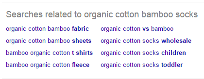 When you make a search at the bottom of the page Google gives you suggestions of searches related to your term - in this case “organic cotton bamboo socks“. These are usually lower competition terms which generate traffic.