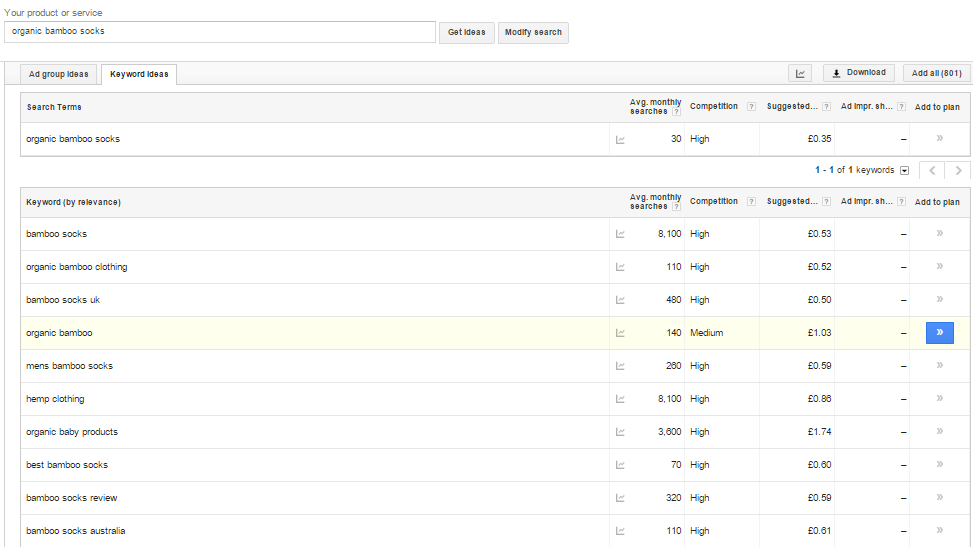 So let’s check “organic bamboo baby socks” in the keyword planner: