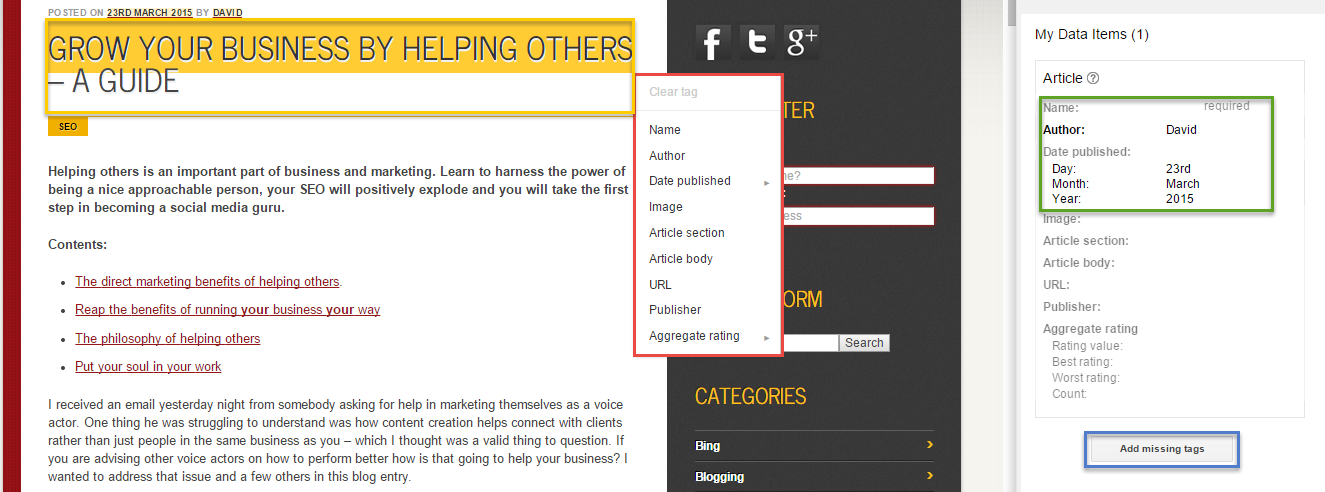 - The blue box allows me to add missing tags - data I don’t want users to be able to see but which I still want marked up.