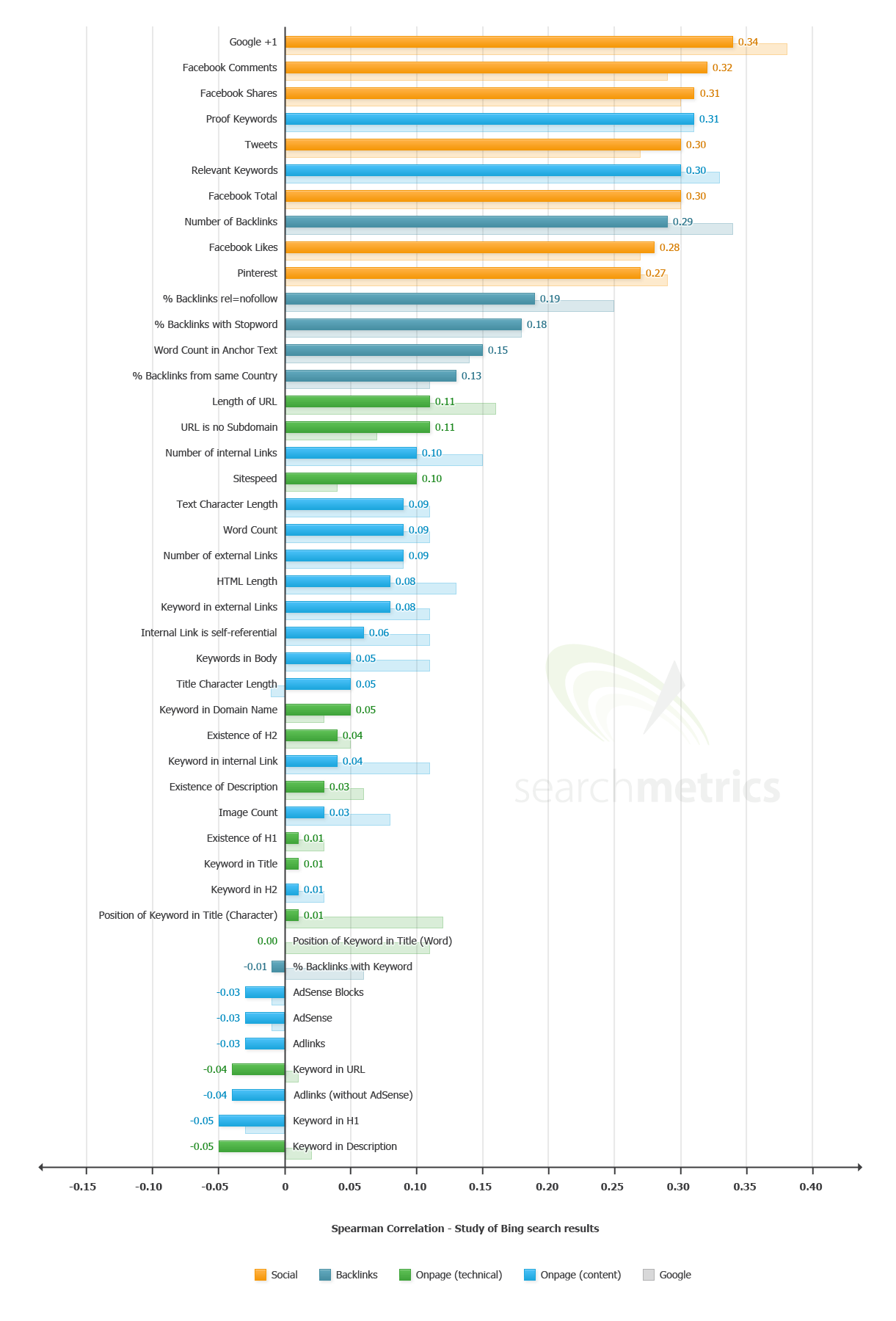 Search Metrics did a similar study on Bing in 2013. This data is old, but it compares Google and Bing using the same ranking factors. Search Metrics show that at least in 2013 if you optimised your website for Google - which is what most SEO is focused on - you were also more likely to rank on Bing.
